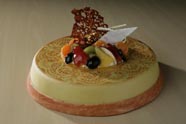 Luchtig amandelgebak flink getrempeerd met Grand Marnier likeur, omgeven met een gegolfde chocoladerand en afgewerkt met rode besjes. Voor de gegolfde chocoladerand is gebruikgemaakt van plastic verpakking gebruikt bij druiven. Het zachte gebak eenmaal gevuld met een frisse vruchtenbavarois kan het alleen maar vervolmaken.