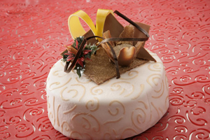 Kerstsfeer gecreëerd met een gouden opdruk op een chocoladetaart en een smaak als het bekende engeltje op de tong. Een cacaobeslag gearomatiseerd met gemberpoeder gebakken, gevuld met licht gebonden perenvulling en afgedekt met bitterkoekjesspijs en roldecor met een toefje goudpoeder. De decoratie is een kleine extra chocoladeverwennerij die nog even bewaard kan blijven en heel eenvoudig van de taart is te halen, om zodoende het taartje keurig in het aantal gewenste punten te kunnen snijden.