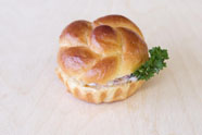 Decoratief briochebroodje gevuld met een heerlijke garnalenmayonaise.